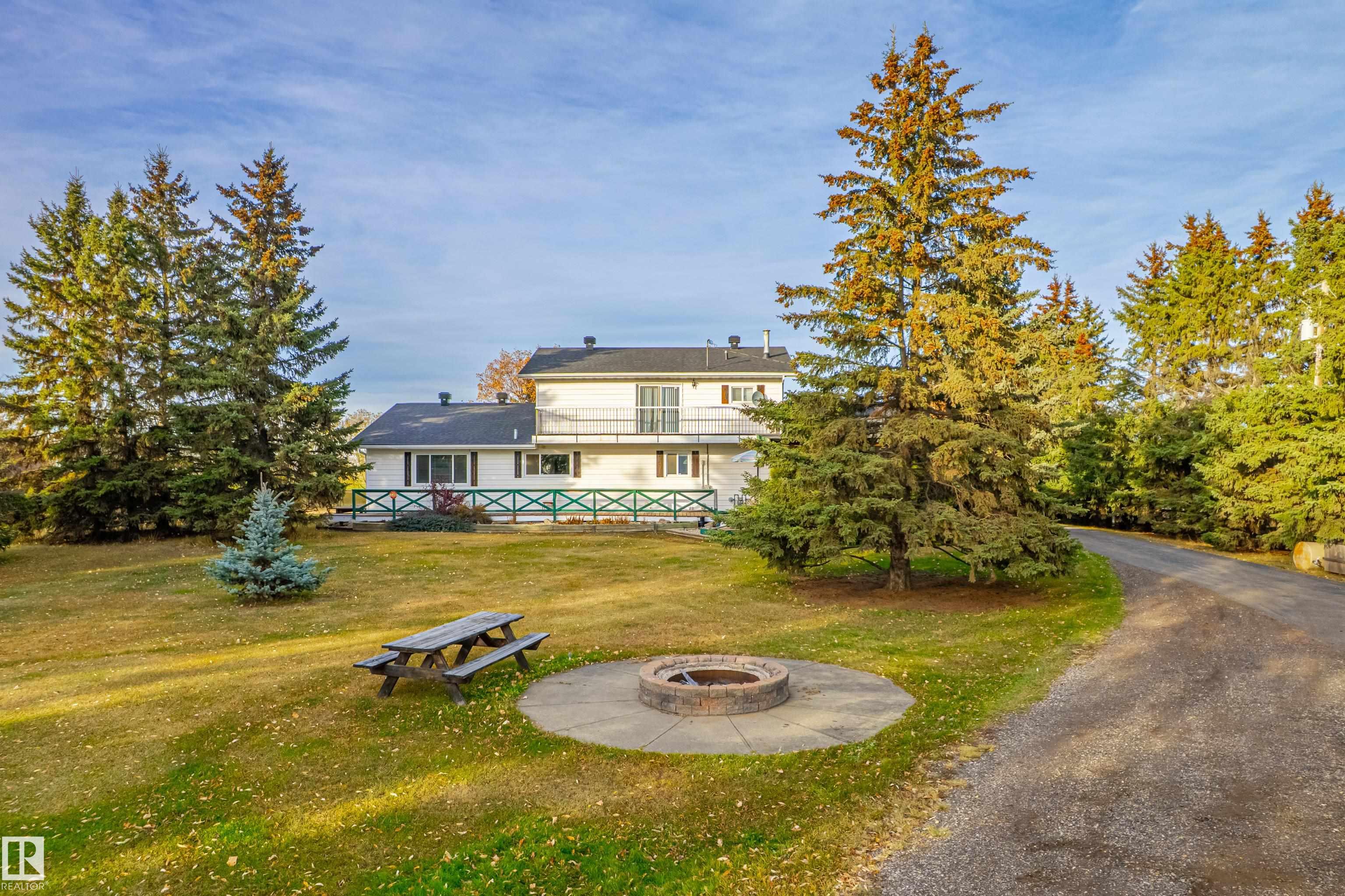 Experience country living on 11 beautiful, fenced acres with a flat, well-treed, park-like setting. This inviting two-storey home (built in 1978) has been extensively updated with a modern kitchen featuring granite counters, refreshed main bath, newer flooring, vinyl windows, shingles, and bright living and family rooms filled with natural light. A cozy gas fireplace adds warmth and charm on cool evenings. Enjoy the outdoors year-round with a covered deck perfect for relaxing or dining outside, and an outdoor fire pit area ideal for entertaining friends and family under the stars. A large heated shop provides space for projects or equipment, plus two additional outbuildings offer ample storage for tools, vehicles, or animals. This property combines comfort, functionality, and tranquility -- a true hobby farmer's dream, ready for you to move in and embrace the peaceful country lifestyle. MLS®: E4463635 - None 2 Storey $789,000